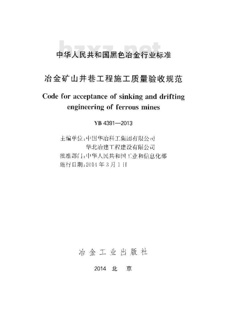 中华人民共和国黑色冶金行业标准冶金矿山井巷工程施工质量验收规范Code for acceptance of sinking and driftingengineering of ferrous minesYB4391—2013