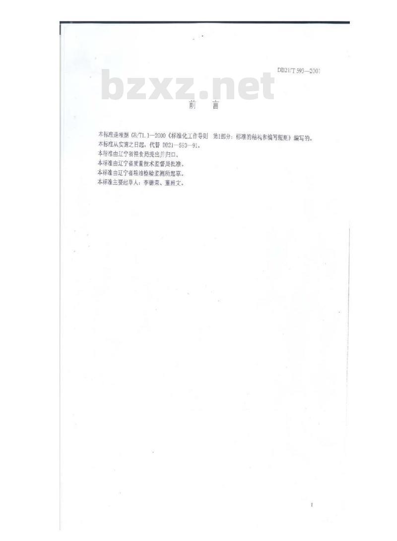 本标准是根据GB/T1.1-2000《标准化工作导则第1部分:标准的结构和编写规则》编写的。本标准从实施之日起,代替DB21-593—91。本标准由辽宁省粮食局提出井归口,本标准由辽宁省质量技术监督局批准。本标准由辽宁省粮油检验监测所起草。本标准主要起草人:李德荣、董殿文。1范围