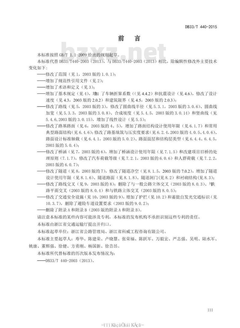 修改了隧道(见8,2003版的7),修改了隧道净空(见8.1.5,2003版的7.0.2),增加了隧道设计使用年限(见8.1.6)、隧道路面(见8.1.8)、隧道洞门(见8.2)和衬砌结构(见8.3);一修改了路线交叉(见9,2003版的8):删除了与一般公路立体交叉(2003版的8.0.3)、铁路平面交叉(2003版的8.0.4)和与铁路立体交叉(2003版的8.0.5):修改了交通安全设施(见10,2003版的9),增加了护拦(见10.2)和蓄能自发光交通标识(见10.3.7),删除了避险车道设置要求(2003版的9.0.2);-删除了附录A和附录B(2003版的附录A和附录B)。请注意本标准的某些内容可能涉及专利,本标准的发布机构不承担识别这些专利的责任。本标准由浙江省交通运输厅提出并归口。本标准起草单位:浙江省公路管理局、浙江省科威工程咨询有限公司。本标准主要起草人:寿华、陈建荣、卢晓慧、张荣福、陈跃军、万毅宏、严志强、吴明、陆水军、姚康、董熙强、徐健、方勇刚、杨国新、徐音昂。本标准所代替标准的历次版本发布情况为:-DB33/T440-2003(2013)。