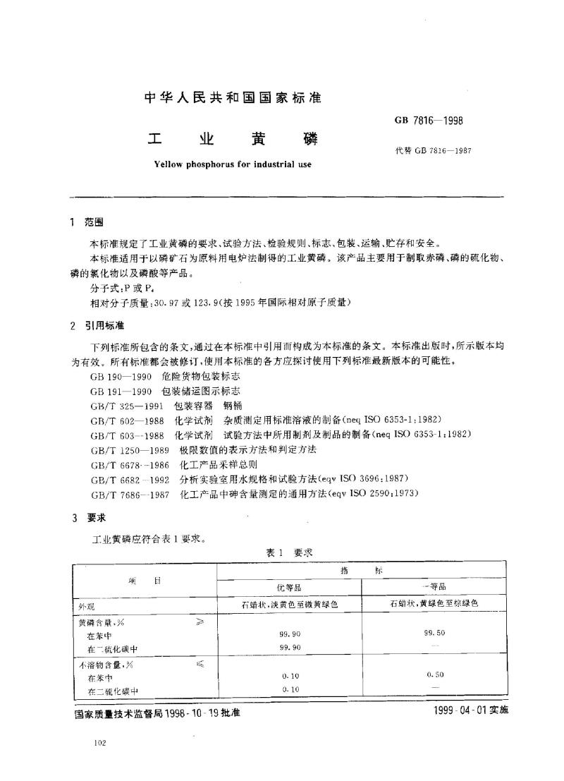 本标准规定了工业黄磷的要求、试验方法、检验规则、标志、包装、运输、贮存和安全。本标准适用于以磷矿石为原料用电炉法制得的工业黄磷。该产品主要用于制取赤磷、磷的硫化物、磷的氯化物以及磷酸等产品。 GB 7816-1998 工业黄磷 GB7816-1998