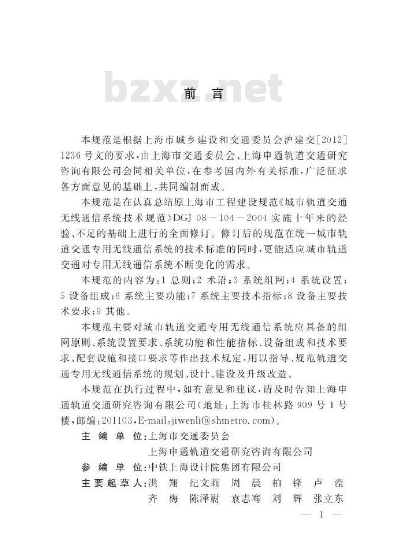 本规范主要对城市轨道交通专用无线通信系统应具备的组网原则、系统设置要求、系统功能和性能指标、设备组成和技术要求、配套设施和接口要求等作出技术规定,用以指导、规范轨道交通专用无线通信系统的规划、设计、建设及升级改造,本规范在执行过程中,如有意见和建议,请及时告知上海申通轨道交通研究咨询有限公司(地址:上海市桂林路909号1号楼,邮编:2ol1o3,E-mail:jiwenli@shmetro.com)主编单位:上海市交通委员会