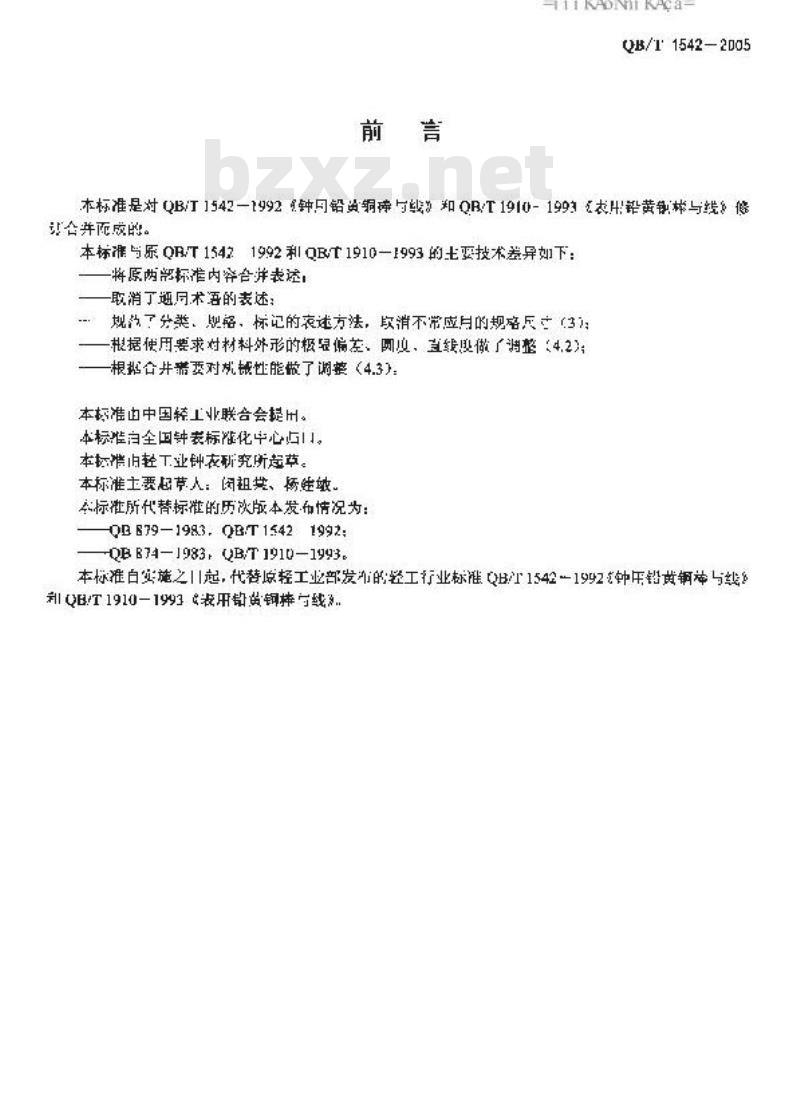 本标准是对QB/1542—1992钟同铅资铜稀与线》知QR/T1910-1993衣件铅黄钟梯与线。假站合并而成的。