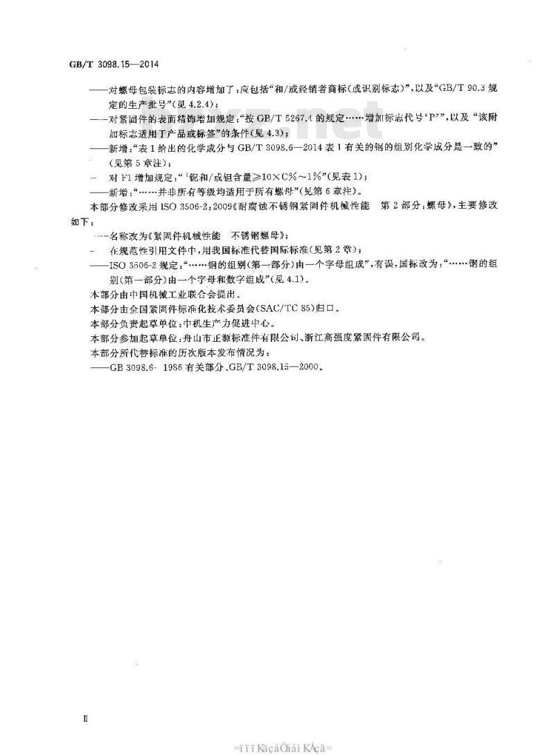 -名称改为《紫固件机械性能不锈钢螺母》:在规范性引用文件中,用我国标推代替国际标推(见第2竞);-ISO.3506-2规定.“.钢的组别(第一部分)由一个字母组成”,有误,国标改为“..钢的组别(第一部分)由一个母和数字组成”(见4.1)。本部分由中国机械工业联合会提出。本部分由全国紧固件标准化技术委员会(SAC/TC85)归口。本部分负责起草单位:中机生产力促进中心。本部分参加起草单位:舟山市正源标准件有限公司、浙江高强度紧固件有限公司。本部分所代替标准的历次版本发布情况为:GB3098.6-1986有关部分.GB/T3098.15—2000。riKicadaaikAca=