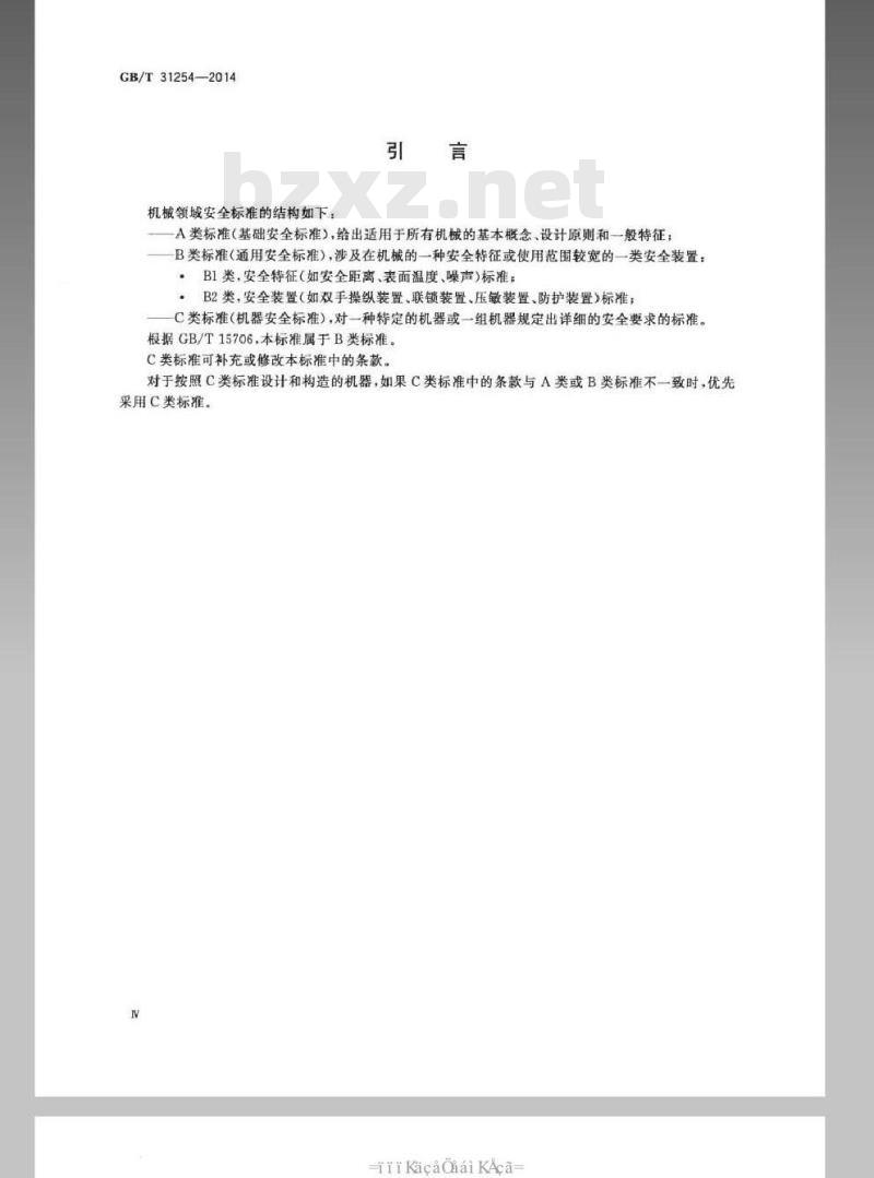 A类标准(基础安全标准),给出适用于所有机械的基本概念、设计原则和一般特征;B类标准(通用安全标准),涉及在机械的一种安全特征或使用范围较宽的一类安全装置:·BI类,安全特征(如安全距离、表面温度、噪声)标准:。B2类,安全装置(如双手操纵装置、联锁装置、压敏装置、防护装置)标准;C类标准(机器安全标准),对一种特定的机器或一组机器规定出详细的安全要求的标准。根据GB/T15706,本标准属于B类标准。C类标准可补充或修改本标准中的条款。对于按照C类标准设计和构造的机器,如果C类标准中的条款与A类或B类标准不一致时优先采用C类标准。