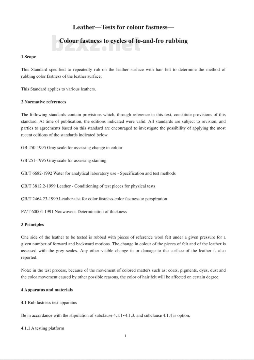 The following standards contain provisions which, through reference in this text, constitute provisions of thisstandard. At time of publication, the editions indicated were valid. All standards are subject to revision, andparties to agreements based on this standard are encouraged to investigate the possibility of applying the mostrecenteditions of thestandards indicatedbelowGB250-1995GrayscaleforassessingchangeincolourGB 251-1995 Gray scale for assessing stainingGB/T6682-1992Waterforanalyticallaboratoryuse-SpecificationandtestmethodsQB/T 3812.2-1999 Leather - Conditioning of test pieces for physical testsQB/T2464.23-1999Leather-testforcolorfastness-colorfastnesstoperspirationFZ/T60004-1991NonwovensDeterminationofthickness3Principles