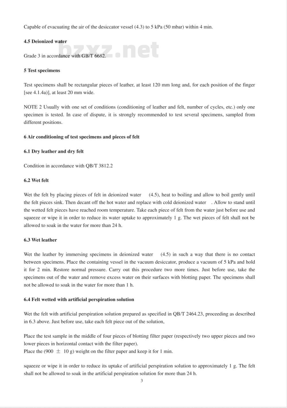 Wet the leather by immersing specimens in deionized water(4.5) in such a way that there is no contactbetween specimens. Place the containing vessel in the vacuum desiccator, produce a vacuum of 5 kPa and holdit for 2 min. Restore normal pressure. Carry out this procedure two more times. Just before use, take thespecimens out of the water and remove excess water on their surfaces with blotting paper. The specimens shallnotbeallowedtosoakinthewaterformorethan1h.6.4FeltwettedwithartificialperspirationsolutionWet the felt with artificial perspiration solution prepared as specified in QB/T 2464.23, proceeding as describedin 6.3above.Justbeforeuse,take eachfeltpiece outofthe solution,Place the test sample in the middle of four pieces of blotting filter paper (respectively two upper pieces and twolower pieces in horizontal contact with the filter paper).Place the (900 ± 10 g) weight on the filter paper and keep it for 1 min.squeeze or wipe it in order to reduce its uptake of artificial perspiration solution to approximately 1 g. The feltshall not be allowed to soak in the artificial perspiration solution for more than 24 h3