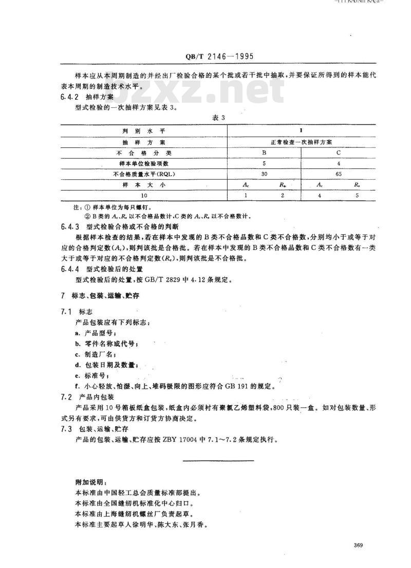 本标准由中国轻工总会质运标准部提出。本标准由全国纫机标准化中心归口。本标准由上海缝纫机螺丝厂负责起草。本标准主婴起草人徐明华、陈大东、张月香。369