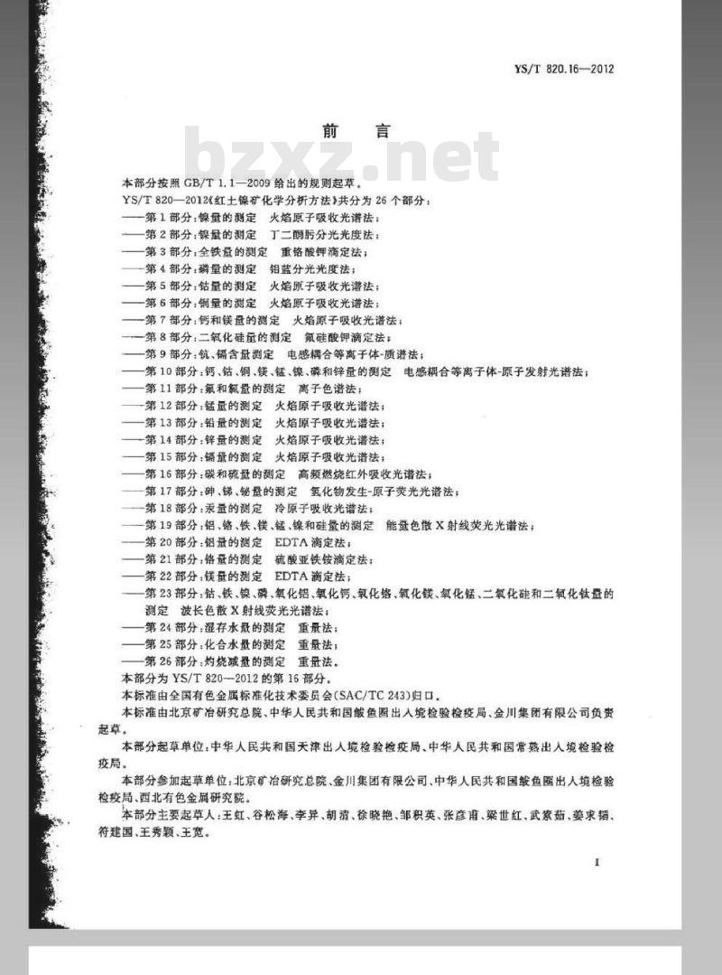 本部分按照GB/T1.1—2009给出的规则起草,YS/T820—2012《红土镍矿化学分析方法》共分为26个部分:一第1部分:镍量的测定火焰原子吸收光谱法;第2部分:镍量的测定