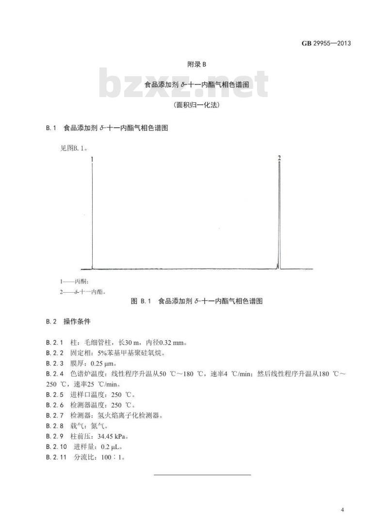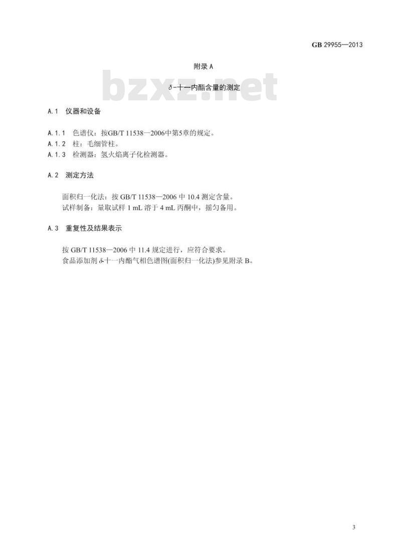 按GB/T11538一2006中11.4规定进行,应符合要求。食品添加剂?十一内酯气相色谱图(面积归一化法)参见附录B。GB29955—2013