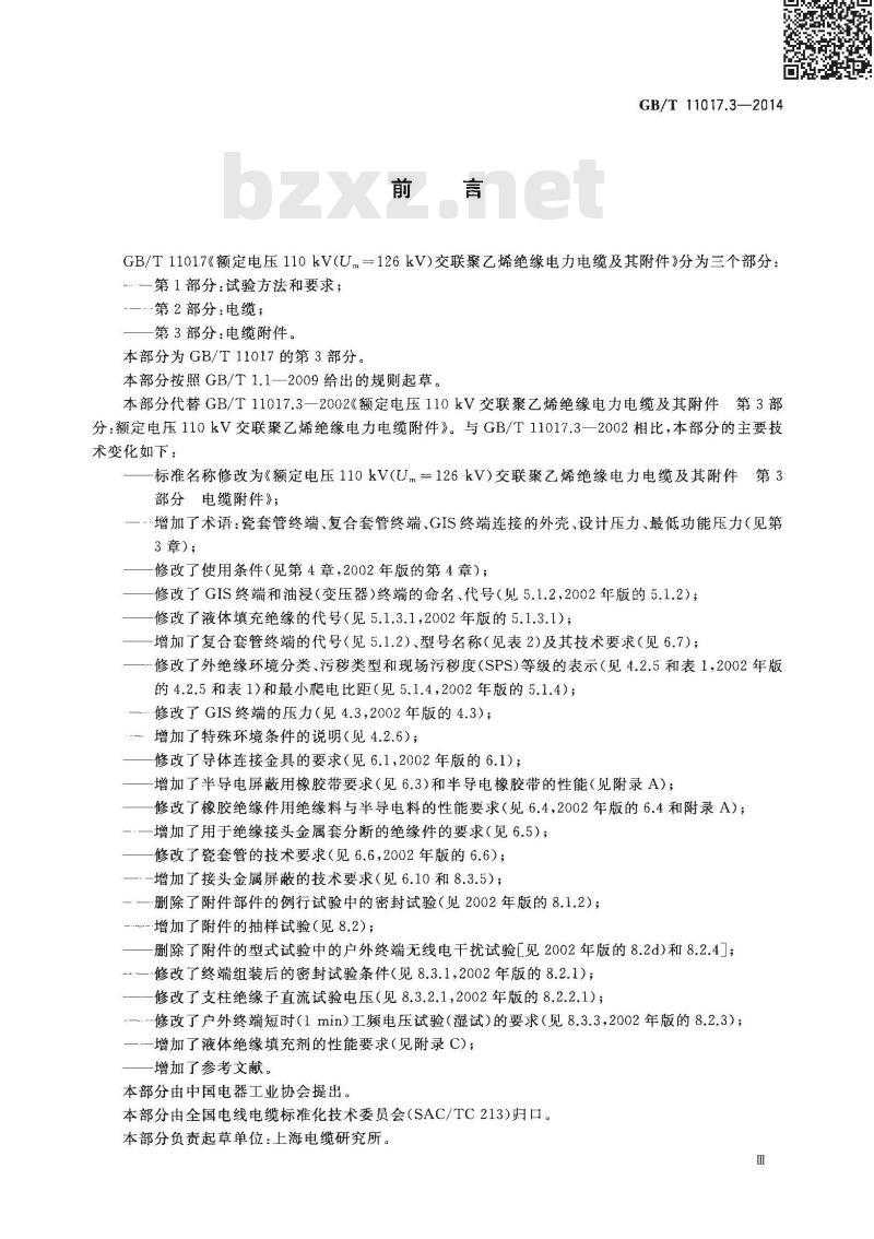 本部分为GB/T11017的第3部分。本部分按照GB/T1.1—2009给出的规则起草。本部分代替GB/T11017.3—2002《额定电压110kV交联聚乙烯绝缘电力电缆及其附件第3部分:额定电压110kV交联聚乙烯绝缘电力电缆附件》。与GB/T11017.3一2002相比,本部分的主要技术变化如下: