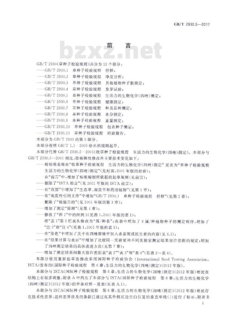 本部分代替GB/T2930.5一2001《牧草种子检验规程生活力的生物化学(四唑)测定》。本部分与GB/T2930.5一2001相比,除编辑性修改外主要技术变化如下:将标准名称由“牧草种子检验规程生活力的生物化学(四唑)测定”更名为“草种子检验规程生活力的生物化学(四唑)测定\(见封面,2001年版的封面);在“前言”中,增加了标准编制所依据的起草规则(见前言);删除了“ISTA前言(见2001年版的ISTA前言);在“范围”中增加了“生态草、观赏草和药用植物”(见第1章);在“规范性引用文件”中增加GB/T2930.1草种子检验规程扦样”(见第2章);删除了“检验目的”(见2001年版的第3章);增加了测定“原理”(见第1章);修改了“图1”中的图例3(见图1,2001年版的图1);将“表1”第2栏表头修改为“属/种名”;在表中增加了9属/种植物种子的测定程序,增加了“注3”和“注4”(见表1,2001年版的表1);在“染色”中增加了关于在四唑溶液中加人杀菌剂或抗生素的内容(见6.3);在“结果计算与表示”中增加了比较同一实验室和不同实验室测定结果容许差距的规定,增加了四唑测定结果的具体表述方法(见第7章);增加了测定结果间最大容许差距表“表2”“表3”和“表4”(见表2~表4)。本部分使用重新起草法修改采用国际种子检验协会(InternationalSeedTestingAssociation,ISTA)发布的《国际种子检验规程第6章:生活力的生物化学(四唑)测定》(2012年版)。本部分与ISTA《国际种子检验规程第6章:生活力的生物化学(四唑)测定》(2012年版)相比在结构上有较多调整,附录A中列出了本部分与ISTΛ《国际种子检验规程第6章:生活力的生物化学(四唑)测定》(2012年版)的章条对照一览表(见表A.1)。本部分与ISTA《国际种子检验规程第6章:生活力的生物化学(四唑)测定》(2012年版)相比存在技术性差异,这些差异涉及的条款已通过在其外侧页边空白位置的垂直单线(I)进行了标示,附录BI