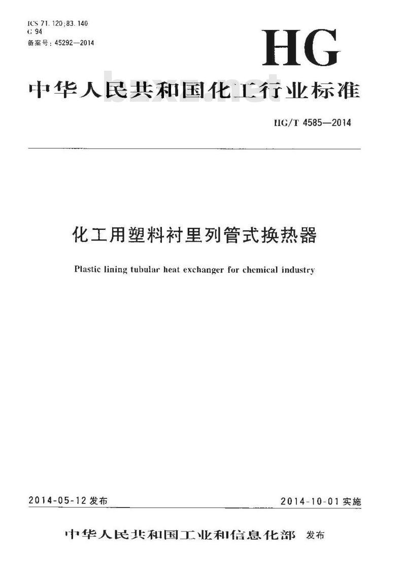 - HG/T 4585-2014 化工用塑料衬里列管式换热器