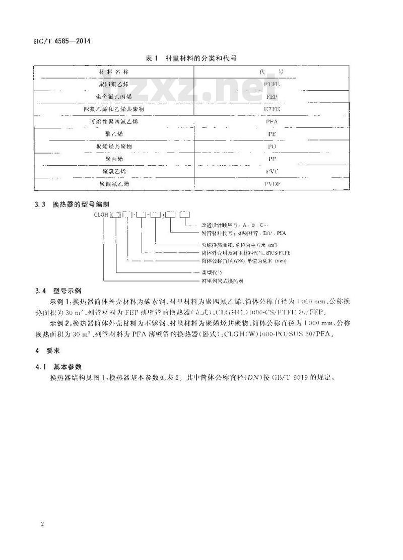 示例1:换热器裔体外无材料对碳素钢、剖业材料为聚四氟乙烯、简体公称直径为)m公称换热积为30划材料为FEP德联管的换热器(文武:HI000-CS/P30/FEP示例2:换热器体外壳材料为不锈钢、剂用材料为聚烯烃其聚物、简体公称径为【000mm1.公称换热间积为30m列管材料为PFA激整管的换热器(卧式):C1.GHW)I000-PO/SUS30/PFA4要求