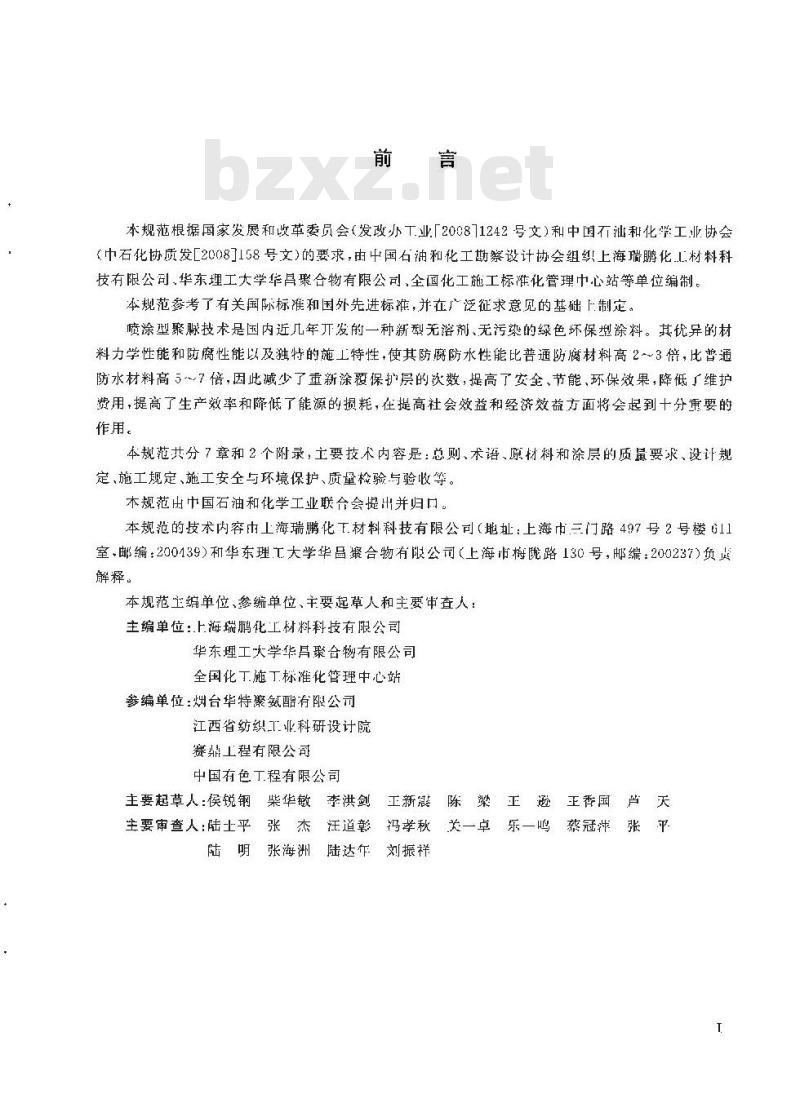 本规范共分7章和2个附录,主要技术内容是:总则、术语、原材料和涂层的质量要求、设计规定、施工规定、施工安全与环境保护、质量检验与验收等。本规范出中国石油和化学工业联合会提出并归。本规范的技术内容市上海瑞鹏化T.材料科技有限公司(地址:上海市三门路497号2号楼G11室邮编:200139)和华东理T大学华昌聚合物有限公司(上海市梅陇路130号,邮编:200237)负贞解释。
