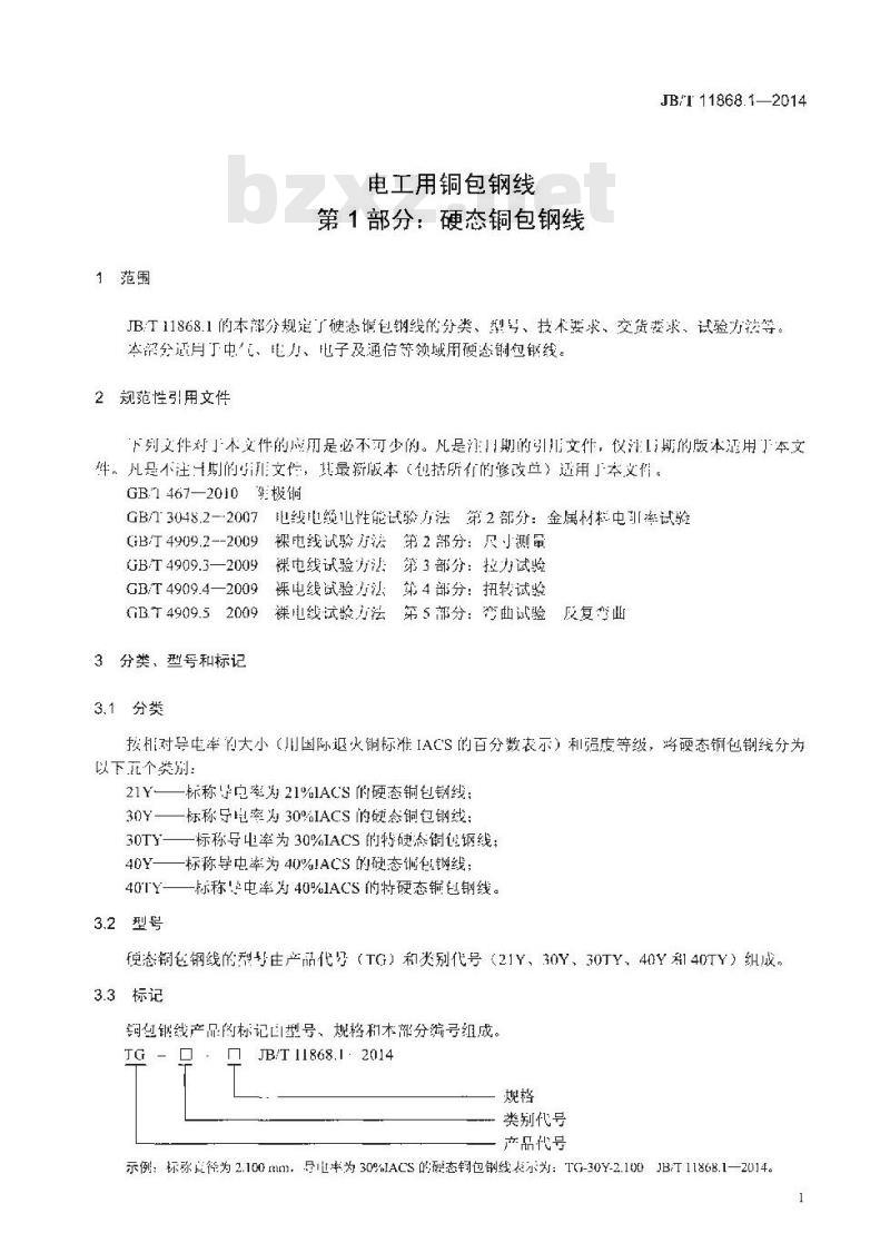 - JB/T 11868.1-2014 电工用铜包钢线 第1部分 硬态铜包钢线
