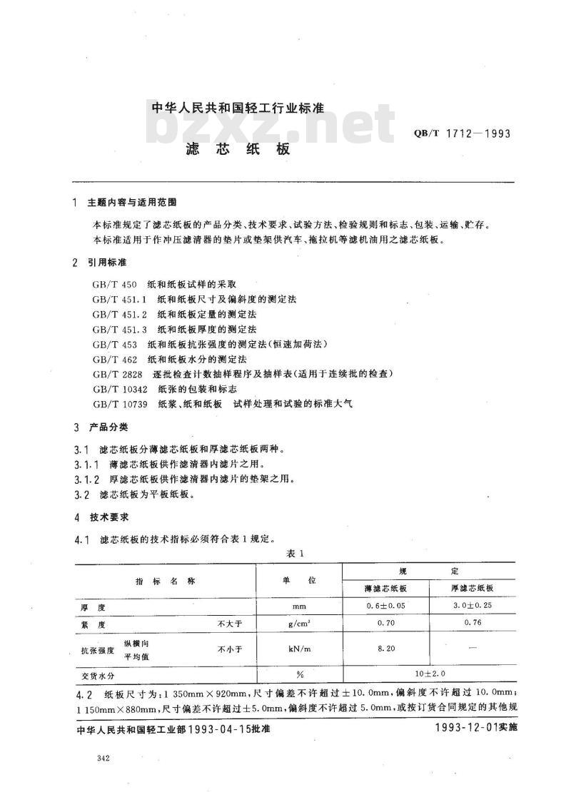 本标准规定了滤芯纸板的产品分类、技术要求、试验方法、检验规则和标志、包装、运输、贮存。本标准适用于作冲压滤清器的垫片或垫架供汽车、拖拉机等滤机油用之滤芯纸板。2引用标准