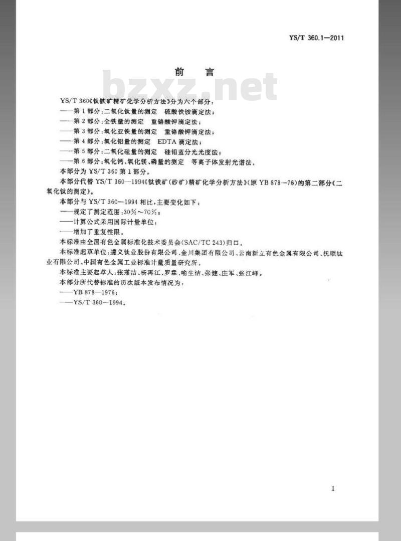 YS/T360的本部分规定了钛铁矿精矿中二氧化钱量的测定方法。YS/T360.1—2011