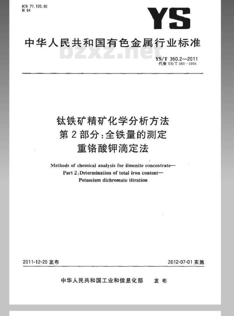 YS/T 360.2-2011 钛铁矿精矿化学分析方法 第2部分:全铁量的测定 重铬酸钾滴定法 YS/T360.2-2011