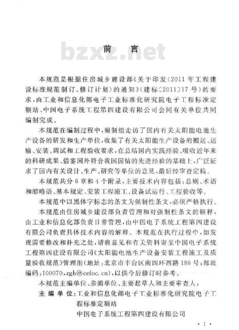 本规范在编制过程中,编制组走访了国内有关太阳能电池生产设备的研发和生产单位,收集了有关太阳能生产设备的搬运、运输、安装,调试和工程验收要求,在总结国内实践经验、吸收近年来的科研成果、借鉴国外符合我国国情的先进经验的基础上,广泛征求了国内有关设计、生产、研究等单位的意见,最后经审查定稿。本规范共分6章和4个附求,主要技术内容包括:总则、术语和缩略语、基本规定、安装工程施工、设备试运行、程验收等。本规范中以黑体字标志的条文为强制性条文,必须严格执行。本规范由住房城乡建设部负责管理和对强制健条文的解释,由工业和信息化部负责口常管理,由中国电子系统工程第四建设有限公司负责具体技术内容的解释,本规范在热行过程中,如发现需要修改和补充之处,请将意见和有美资料寄至中国电子系统工程第四建设有限公司《太阳能电池牛产设备安装工程施工及质量验收规范》管理组(地址:北京市丰台区南四环西路188号:邮政编码:100o70,zgb@cefoc,cn),以供今后修订时参考。本规范主编单位、参编单位、主要起草人和主要审查人主编单位:T业和信息化部电子工业标准化研究院电子工程标准定额站