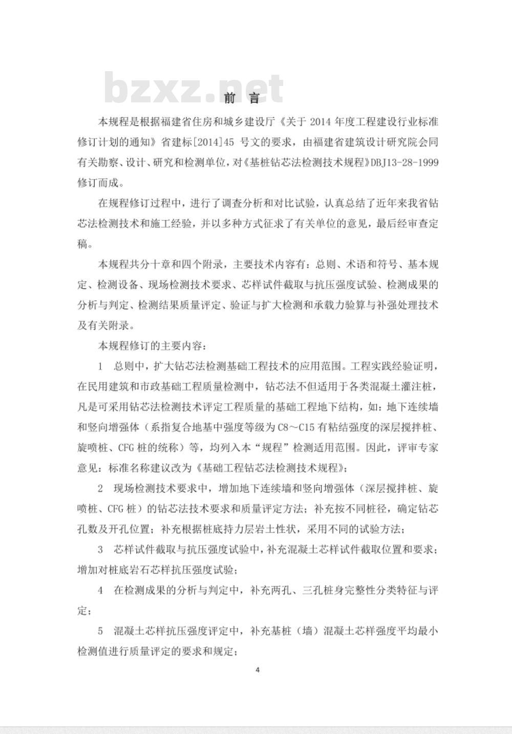 本规程是根据福建省住房和城乡建设厅《关于2014年度工程建设行业标准修订计划的通知》省建标[2014]45号文的要求,由福建省建筑设计研究院会同有关勘察、设计、研究和检测单位,对《基桩钻芯法检测技术规程》DBJ13-28-1999修订而成。