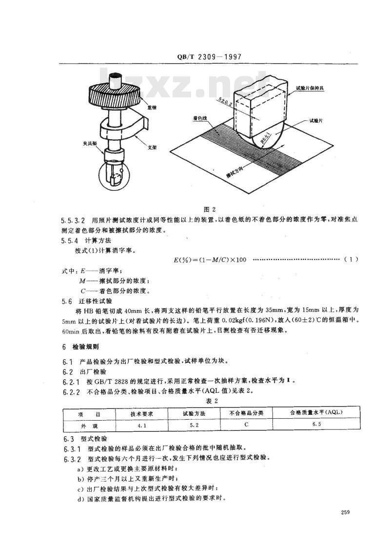 将HB铅笔切成40mm长,将两支这样的铅笔平行放置在长度为35mm,宽为15mm以上,厚度为5mm以上的试验片上(对着试验片的长边)。笔上荷重0.02kgf(0.196N),放人(60士2)℃的恒温箱中。60min后取出,看铅笔的涂料有没有附着在试验片上,县测检查有否迁移现象。6检验规则