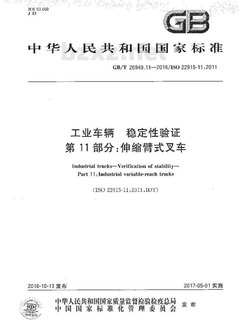 - GB/T 26949.11-2016 工业车辆 稳定性验证 第11部分:伸缩式叉车