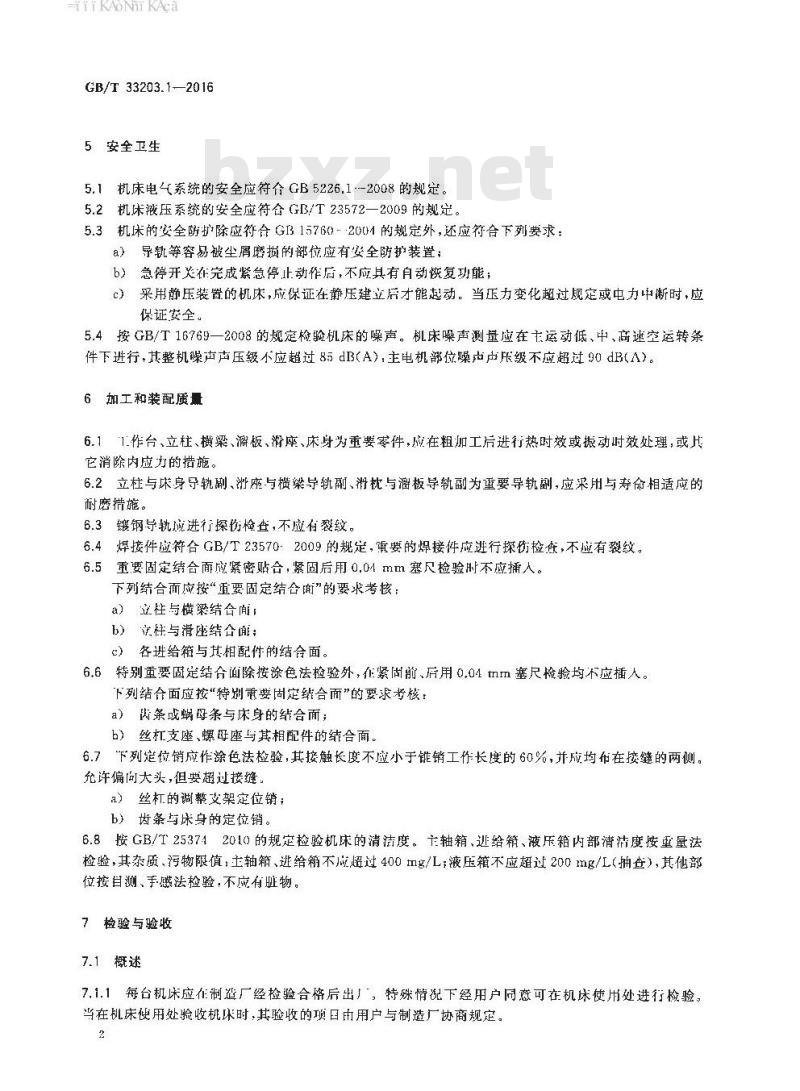 5.1机床电气系统的安全应符合GB5226.1-2008的规定。5.2机床滋压系统的安全应符含GB/T23572一2009的规定5.3机床的安全防扩除应符合G3157602004的规定外,还应符合下列要求;a)导轨等容易被尘屑磨损的部莅应有安全防护装置b)急停开关在完成紧急停止动作后,不应具有自动恢复功能c)采用静压装置的机床,应保证在静压建立后才能起动。当压力变化超过规定或力中断时,应保证安全。