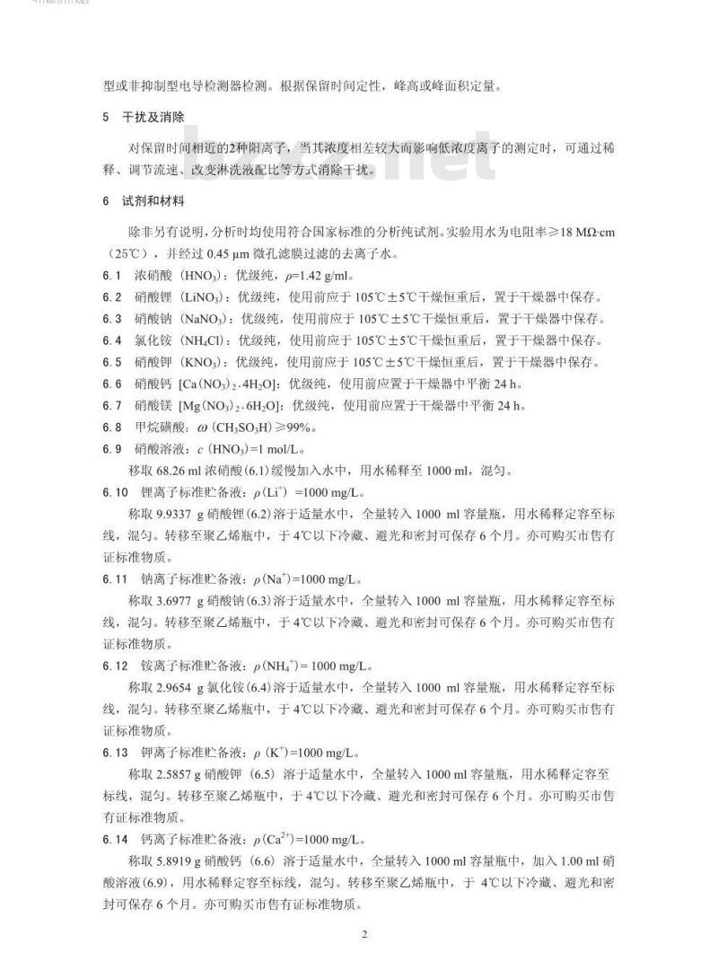 除非另有说明,分析时均使用符合国家标准的分析纯试剂。实验用水为电阻率≥18M2-cm(25℃),并经过0.45μm微孔滤膜过滤的去离子水。6.1浓硝酸(HNO3):优级纯,p=1.42g/ml。6.2硝酸锂(LiNO3):优级纯,使用前应于105℃土5℃干燥恒重后,置于干燥器中保存。6.3硝酸钠(NaNO3):优级纯,使用前应于105℃土5℃干燥恒重后,置于干燥器中保存。6.4氯化铵(NH4CI):优级纯,使用前应于105℃土5℃干燥恒重后,置于干燥器中保存。6.5硝酸钾(KNO3):优级纯,使用前应于105℃土5℃干燥恒重后,置于干燥器中保存。6.6硝酸钙[Ca(NO3)2.4H2O]:优级纯,使用前应置于干燥器中平衡24h。6.7硝酸镁[Mg(NO3)2.6H2O]:优级纯,使用前应置于干燥器中平衡24h。6.8甲烷磺酸:の(CH3SO,H)≥99%。6.9硝酸溶液:c(HNO3)=1mol/L。移取68.26ml浓硝酸(6.1)缓慢加入水中,用水稀释至1000ml,混匀。6.10锂离子标准贮备液:p(Li+)=1000mg/L。称取9.9337g硝酸锂(6.2)溶于适量水中,全量转入1000ml容量瓶,用水稀释定容至标线,混匀。转移至聚乙烯瓶中,于4℃以下冷藏、避光和密封可保存6个月。亦可购买市售有证标准物质。