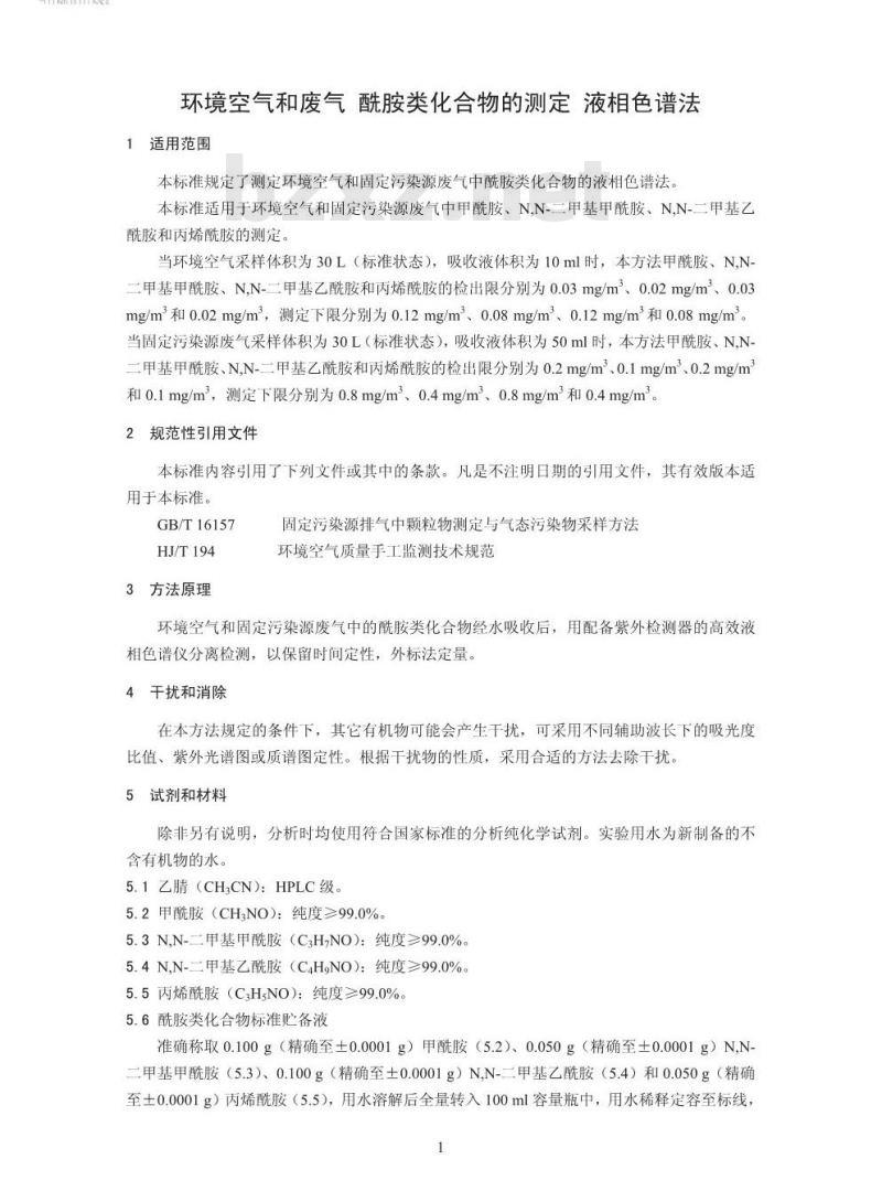 为贯彻《中华人民共和国环境保护法》和《中华人民共和国大气污染防治法》,保护环境保障人体健康,规范环境空气和固定污染源废气中酰胺类化合物的测定方法,制定本标准。本标准规定了测定环境空气和固定污染源废气中酰胺类化合物的液相色谱法。本标准为首次发布。