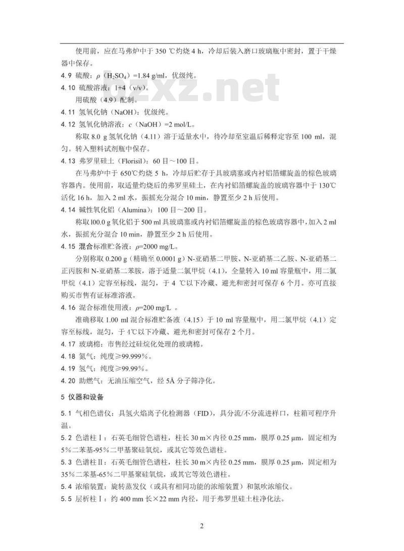4.13弗罗里硅土(Florisil):60目~100目。在马弗炉中于650℃灼烧5h,冷却后贮存于具玻璃塞或内衬铝箔螺旋盖的棕色玻璃容器内。使用前,取适量灼烧后的弗罗里硅土,在内衬铝箔螺旋盖的玻璃容器中于130℃活化16h,加入2ml水,振摇充分混合10min,静置至少2h后使用。4.14碱性氧化铝(Alumina):100目~200目。称取100.0g氧化铝于500ml具玻璃塞或内衬铝箔螺旋盖的棕色玻璃容器中,加入2ml水,振摇充分混合10min,静置至少2h后使用。4.15混合标准贮备液:p=2000mg/L。分别称取0.200g(精确至0.0001g)N-亚硝基二甲胺、N-亚硝基二乙胺、N-亚硝基二正丙胺和N-亚硝基二苯胺,溶于适量二氯甲烷(4.1),全量转入10ml容量瓶中,用二氯甲烷(4.1)定容至标线,混匀,于4℃以下冷藏、避光和密封可保存6个月。亦可直接购买市售有证标准溶液。