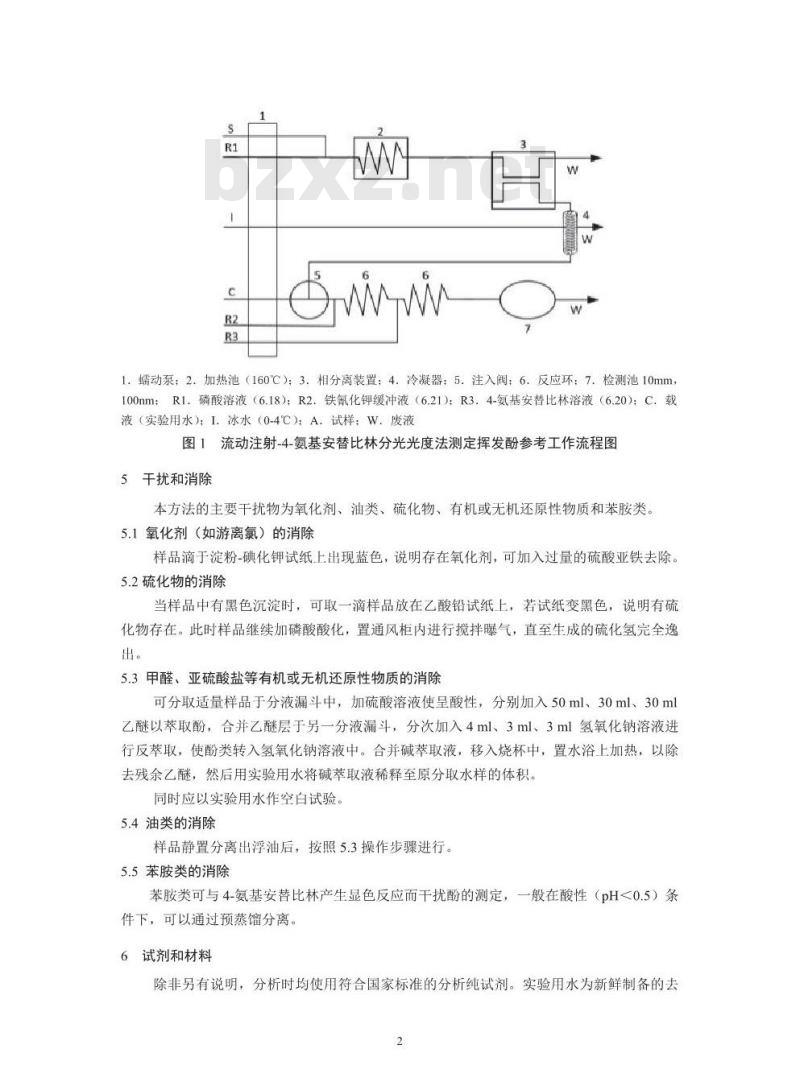1.蠕动泵;2.加热池(160℃);3.相分离装置;4.冷凝器;5.注入阀;6.反应环:7.检测池10mm,100nm:R1.磷酸溶液(6.18):R2.铁氰化钾缓冲液(6.21):R3.4-氨基安替比林溶液(6.20);C.载液(实验用水);I.冰水(0-4℃):A.试样:W.废液图1流动注射-4-氨基安替比林分光光度法测定挥发酚参考工作流程图5干扰和消除