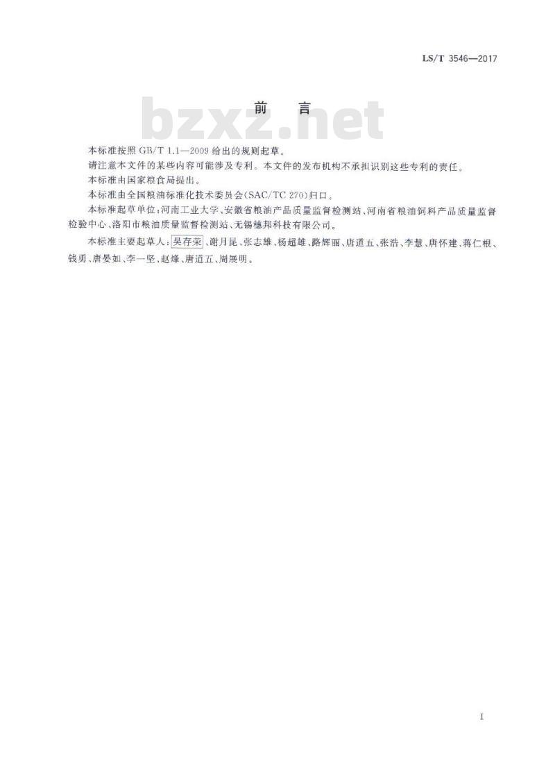 本标准由全国粮油标准化技术委员会(SAC/TC270)归口。本标准起草单位:河南工业大学、安徽省粮油产品质量监督检测站、河南省粮油伺料产品质量监督检验中心、洛阳市粮油质量监督检测站、无锡穗邦科技有限公司。本标准主要起草人:吴存荣、谢月昆、张志雄、杨超雄、路辉丽、唐道五、张浩、李慧、唐怀建、蒋仁根、钱勇、唐晏如、李一坚、赵烽、唐道五、周展明。I
