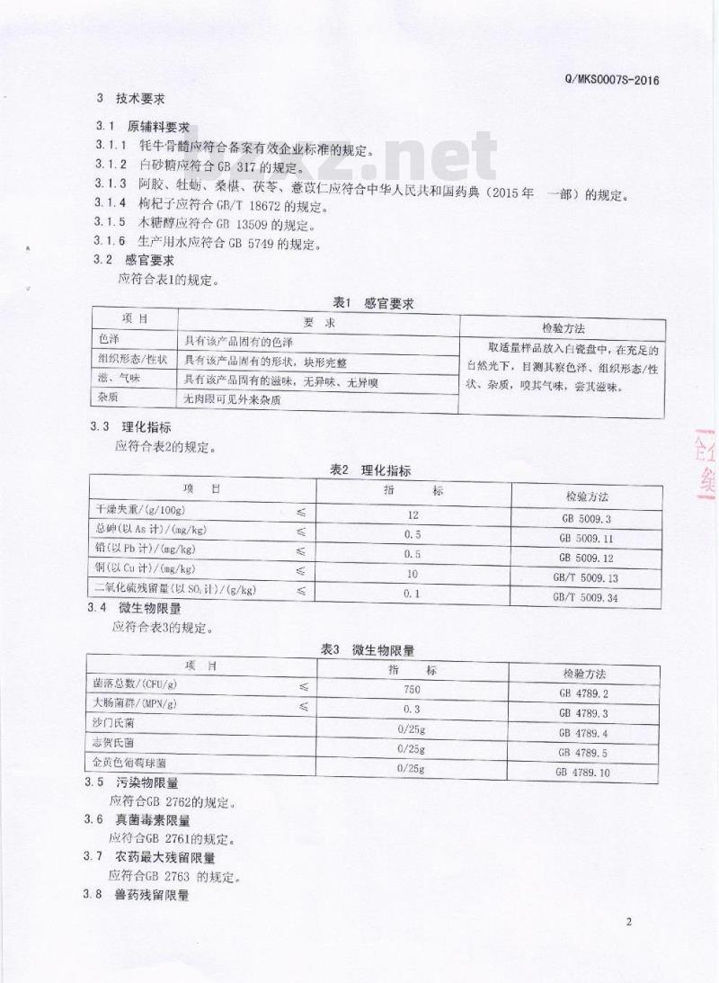 3.1.4枸杞子应符合GB/T18672的规定。3.1.5木糖醇应符合GB13509的规定。3.1.6生产用水应符合GB 5749的规定。3.2感官要求