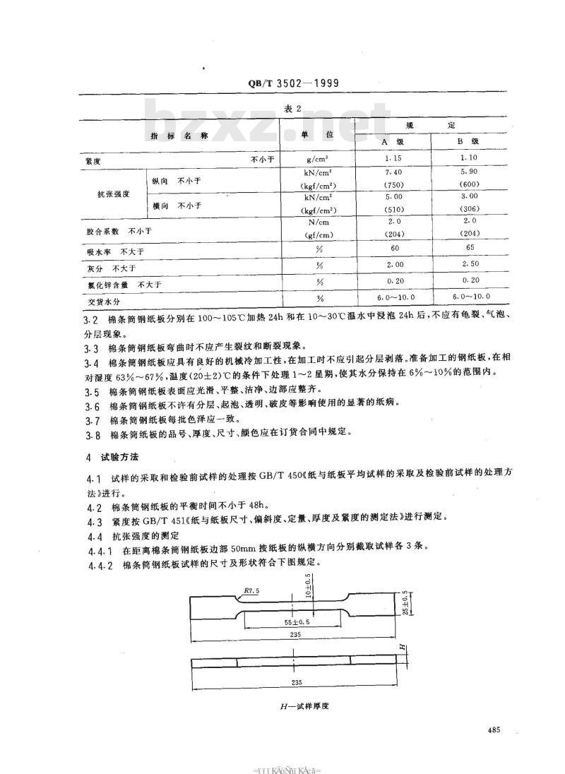 4.2棉条筒钢纸板的平衡时间不小于48h。4.3紧度按GB/T451《纸与纸板尺寸、偏斜度、定量、厚度及紧度的测定法》进行测定。4.4抗张强度的测定