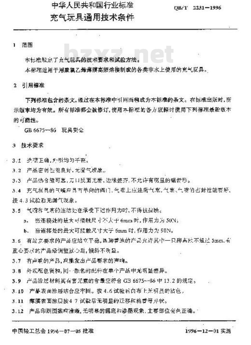 本标准规定了充气玩具的技术要求和试验方法。本标准适用于用聚抓乙烯薄膜高频熔接制成的各类非水上使用的充气玩具。 QB/T 2231-1996 充气玩具通用技术条件 QB/T2231-1996