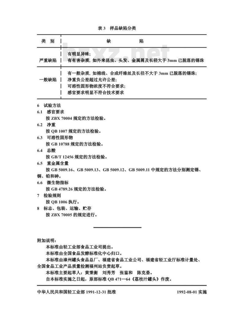 本标准由轻工业部食品工业司提出。本标准由全国食品发酵标准化中心归口。本标准由漳州罐头食品总厂、福建省食品工业公司、福建省轻工业厅标准计量处、全国食品工业产品质量检测福州站负责起草。本标准主要起草人:黄秉衡刘秀芳张鉴和陈克晏。自本标准实施之日起,原部标准QB471一64《荔枝汁罐头》作废。中华人民共和国轻工业部1991-12-31批准1992-08-01实施