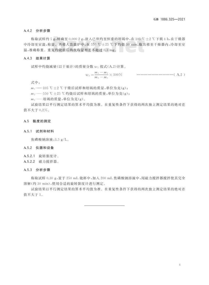 称取试样约5g,精确至0.0002g,放入已炽灼至恒重的中,在105℃土2℃下烘4h,在干燥器中冷却至室温,称量。再移入高温炉中,在550℃土25℃下灼烧30min,取出移至干燥器内,冷却至室温,准确称重。重复灼烧前后两次称量相差不超过0.3mg。A.4.3