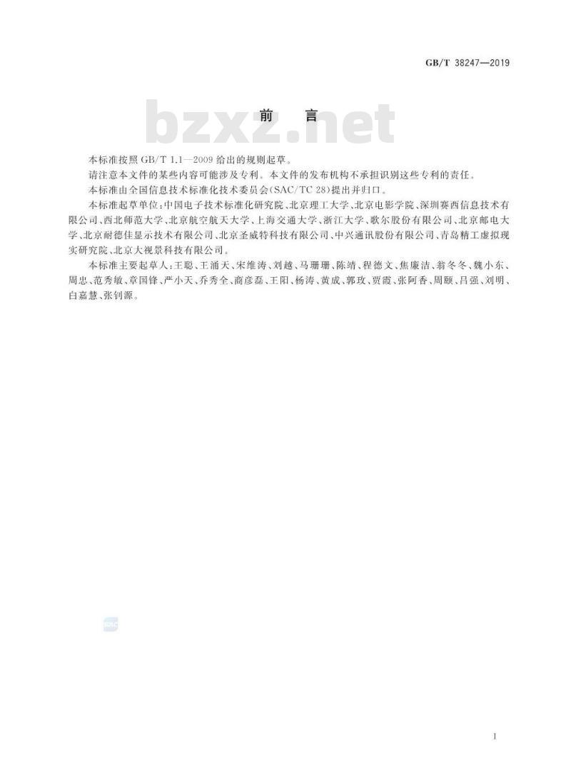 请注意本文件的某些内容可能涉及专利。本文件的发布机构不承担识别这些专利的责任。本标准由全国信息技术标准化技术委员会(SAC/TC28)提出并归口。本标准起草单位:中国电子技术标准化研究院、北京理工大学、北京电影学院、深圳赛西信息技术有限公司、西北师范大学、北京航空航天大学、上海交通大学、浙江大学、歌尔股份有限公司、北京邮电大学、北京耐德佳显示技术有限公司、北京圣威特科技有限公司、中兴通讯股份有限公司、青岛精工虚拟现实研究院、北京大视景科技有限公司。本标准主要起草人:王聪、王涌天、宋维涛、刘越、马珊珊、陈靖、程德文、焦廉洁、翁冬冬、魏小东、周忠、范秀敏、章国锋、严小天、乔秀全、商彦磊、王阳、杨涛、黄成、郭玫、贾霞、张阿香、周颐、吕强、刘明、白嘉慧、张钊源。