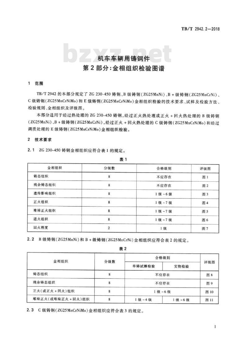 TB/T 2942.2-2018 机车车辆用铸钢件 第2部分:金相组织检验图谱 Steel castings for rolling stock- Part 2: Metallographic atlas for metallographic microstructure examination PDF格式,免费下载。 部分内容摘选如下: 1 范围 TB/T 2942的本部分规定了ZG230.450铸钢、B级铸钢(ZG25MnNi)、B+级铸钢(ZG25 MaCrI)、 C级铸钢(225 MncrNiMo)和E级铸钢(Z025 MnCrNiMo)金相组织检验的技术要求、试样及检验方法、检验规则、金相组织及评级图 本部分适用于经过热处理的ZC230450铸钢,经过正火热处理或正火+回火热处理的B级铸钢 (2C25MnNi)、B+级铸钢(Z025 MnCrNi),经过正火+回火热处理的C级铸钢(ZC25 MnCrNiMe)和经过调质处理的E级铸钢(ZC25 MnCrNiMo)金相组织检验。