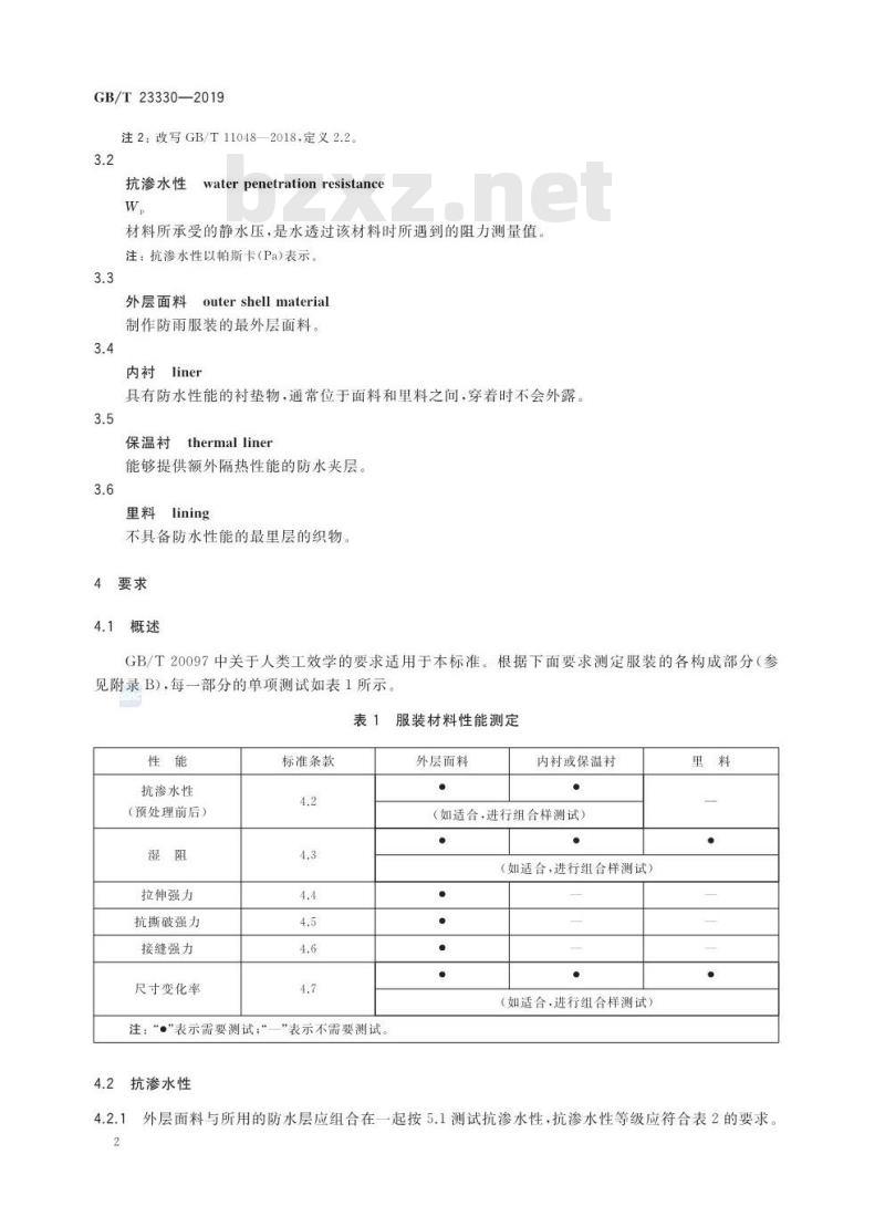 本标准对防雨服装的面料和接缝性能提出了测定和分级要求,据此确定防雨服装所达到的防雨水平。抗渗水性、湿阻是防雨服装的必需性能,需要进行测定并在标签上标注。作为防雨服装最重要的性能指标,抗渗水性可在服装外层面料上进行测试。测试可在预处理前和预处理后的织物试样和接缝部位进行防水材料分为具有透汽性能和不具有透汽性能两类,前者在湿阻指标较低时,可以增强汗液挥发,有利于人体降温。优良的透汽性有利于提高人体舒适性并减轻生理疲劳,可以延长服装在特定气候条件下的连续穿着时间(参见附录A)。1范围