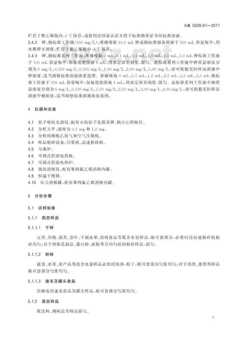 标准号:GB 5009.91-2017 标准名称:食品中钾、钠的测定 英文名称:Determination of potassium and sodium in food 标准格式:PDF 发布时间:2017-04-06 实施时间:2017-10-06 标准大小:279K 标准介绍: 本标准代替GB/T5009.91—2003《食品中钾、钠的测定》、GB/T15402—1994《水果、蔬菜及其制品钠、钾含量的测定》、NY82.18—1988《果汁测定方法 钾和钠的测定》,以及GB5413.21—2010《食品安全国家标准 婴幼儿食品和乳品中钙、铁、锌、钠、钾、镁、铜和锰的测定》、GB/T18932.11—2002《蜂蜜中钾、磷、铁、钙、锌、铝、钠、镁、硼、锰、铜、钡、钛、钒、镍、钴、铬含量的测定方法 电感耦合等离子体原子发射光谱(ICP-AES)法》、GB/T18932.12—2002《蜂蜜中钾、钠、钙、镁、锌、铁、铜、锰、铬、铅、镉含量的测定方法 原子吸收光谱法》和NY/T1653—2008《蔬菜、水果及制品中矿质元素的测定 电感耦合等离子体发射光谱法》中有关钾、钠的检测部分。 本标准与以上标准相比,主要变化如下: ———标准名称修改为“食品安全国家标准 食品中钾、钠的测定”; ———修改了火焰原子吸收光谱法作为第一法,火焰原子发射光谱法作为第二法,电感耦合等离子体发射光谱法作为第三法,电感耦合等离子体质谱法作为第四法; ———修改了试样制备部分内容; ———修改了试样消解部分内容; ———增加了方法检出限及定量限; ———增加了附录。 本标准规定了食品中钾、钠的火焰原子吸收光谱法、火焰原子发射光谱法、电感耦合等离子体发射 光谱法和电感耦合等离子体质谱法四种测定方法 本标准适用于食品中钾、钠的测定 第一法火焰原子吸收光谱法 2原理 试样经消解处理后,注入原子吸收光谱仪中,火焰原子化后钾、钠分别吸收766.5nm、589.0mm共 振线,在一定浓度范围内,其吸收值与钾、钠含量成正比,与标准系列比较定量 3试剂和材 除非另有说明,本方法所用试剂均为优级纯,水为GB/T6682规定的二级水。 3.1试 3.1.1硝酸(HNO3)。 3.1.2高氯酸(HClO4) 3.1.3氯化铯(CsCl1)。 3.2试剂配制 合酸[高氯酸十硝酸(1+9)]:取100ml高氯酸,缓慢加入900mL硝酸中,混匀 硝酸溶液(1+99):取10mL硝酸,缓慢加入990mL水中,混匀 氯化铯溶液(50g/L):将50g氯化铯溶于水,用水稀释至100mL 33标准品 3.3.1氯化钾标准品(KC1):纯度大于9999% 3.32氯化钠标准品(NaCl):纯度大于99.99%。