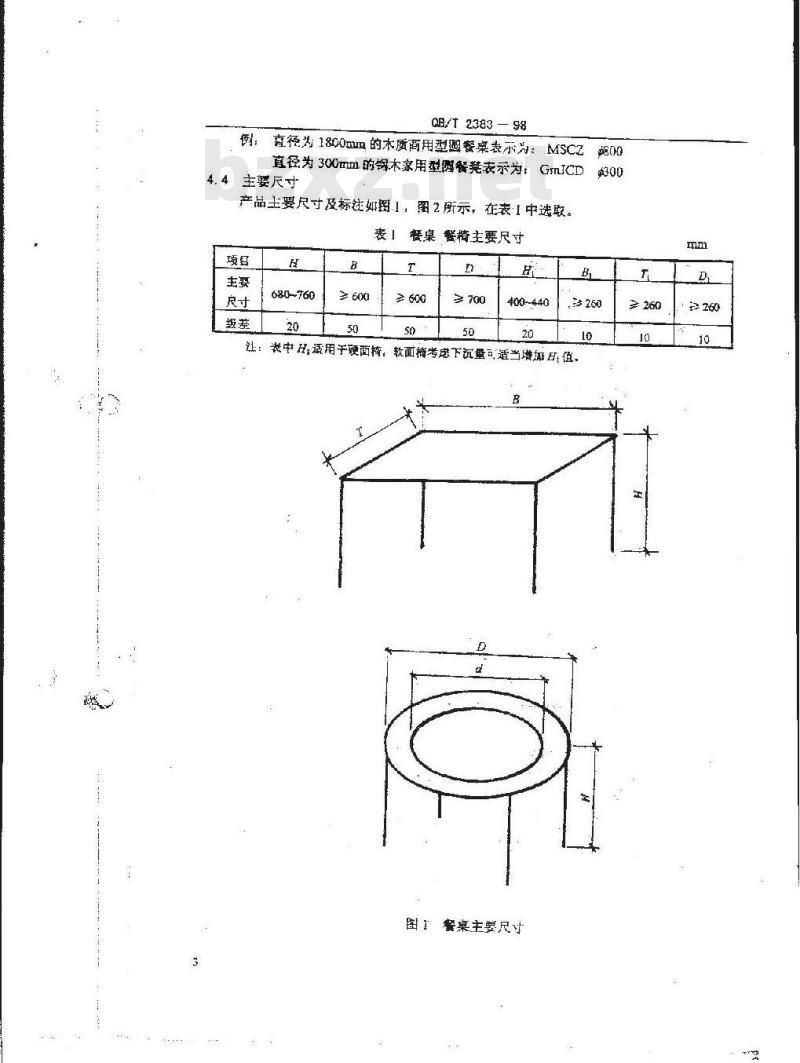 本标准规定了餐桌餐椅(以下简称“产品”)的产品分类、技术要求、试验方法、检验规则及标志、标滚、包装等要求。本标准适用于主要材料由木材或木质人造材料或(和)金属材料构成的产品,其他材料构成的产品可参照执行。本标准不适用于桌椅连为一体的餐桌和餐椅。 QB/T 2383-1998 餐桌餐椅 QB/T2383-1998