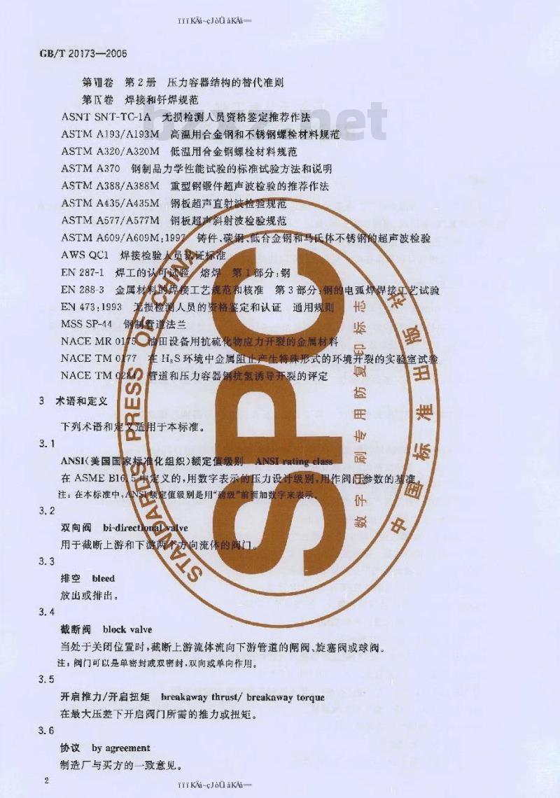本标准适用于石油天然气工业领域管道系统中,满足ISO13623石油天然气工业管道输送系统》要求的球阀、止回阀、闸阀和旋塞阀,规定了设计、制造、试验和文件等方面的要求及建议。本标准不适用于额定压力值超过PN420(2500磅级)的阀门附录A提供的订购指南有助于买方确定阀门的类型和确定阀门的特殊要求。2规范性引用文件
