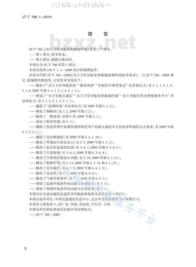 本部分按照GB/T1.1—2009给出的规则起草。本部分代替JT/T766-—2009《北斗卫星导航系统船舶监测终端技术要求》。与JT/T766—2009相比,除编辑性修改外,主要技术变化如下:-修改了“北斗卫星导航系统”“服务频度”“发射信号频率容差”术语和定义(见3.1.1、3.1.5、3.1.6,2009年版3.1.1、3.1.4、3.1.5);增加了“北斗短报文通信”“北斗卫星导航系统船载终端”“北斗导航民用分理级服务平台”术语和定义(见3.1.2、3.1.3、3.1.7);删除了“监测终端\术语和定义(见2009年版3.1.2);一修改了缩略语(见3.2,2009年版3.2);修改了一般要求(见第4章,2009年版4.1);一增加了服务控制(见5.3);