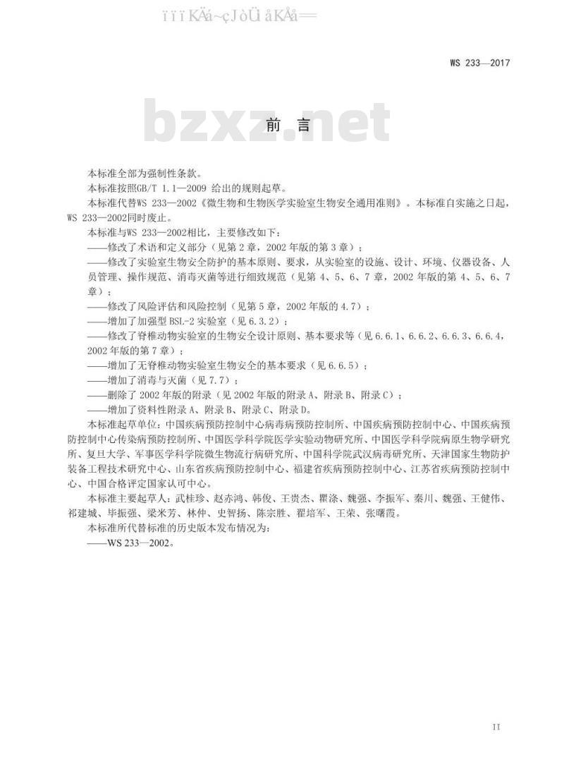 -删除了2002年版的附录(见2002年版的附录A、附录B、附录C):增加了资料性附录A、附录B、附录C、附录D。本标准起草单位:中国疾病预防控制中心病毒病预防控制所、中国疾病预防控制中心、中国疾病预防控制中心传染病预防控制所、中国医学科学院医学实验动物研究所、中国医学科学院病原生物学研究所、复且大学、军事医学科学院微生物流行病研究所、中国科学院武汉病毒研究所、天津国家生物防护装备工程技术研究中心、山东省疾病预防控制中心、福建省疾病预防控制中心、江苏省疾病预防控制中心、中国合格评定国家认可中心。本标准主要起草人:武桂珍、赵赤鸿、韩俊、王贵杰、翟涤、魏强、李振军、秦川、魏强、王健伟、祁建城、毕振强、梁米芳、林仲、史智扬、陈宗胜、翟培军、王荣、张曙霞。本标准所代替标准的历史版本发布情况为:-WS233—2002。
