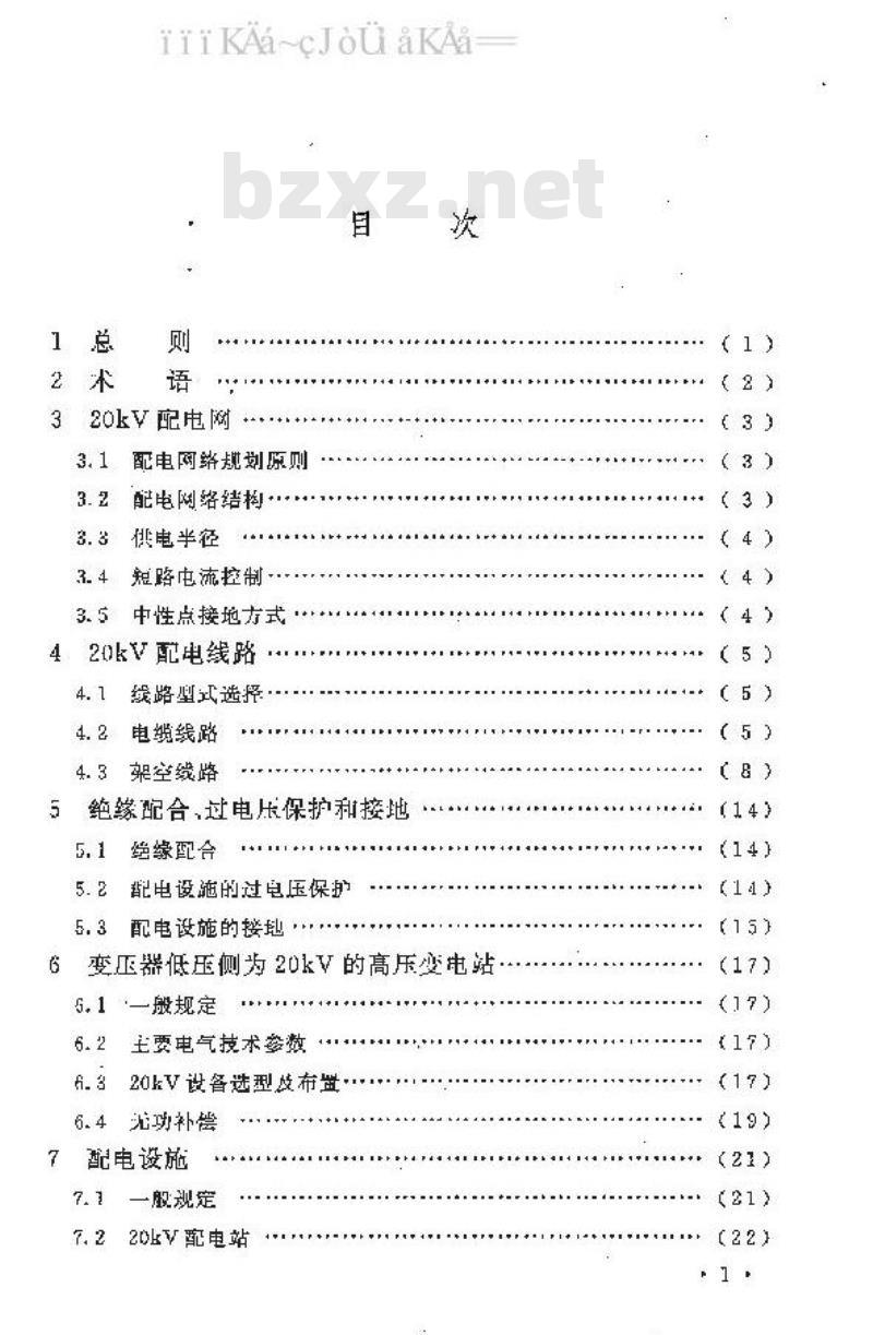 本标准共分9章和3个附录,主要内容包括:总则,术语20kV配电网,20kV配电线路,绝缘配合、过电压保护和接地,变压器低压侧为20kV的高压变电站,配电设施,继电保护、控制、计量及配电自动化,环保与节能等设计要求。