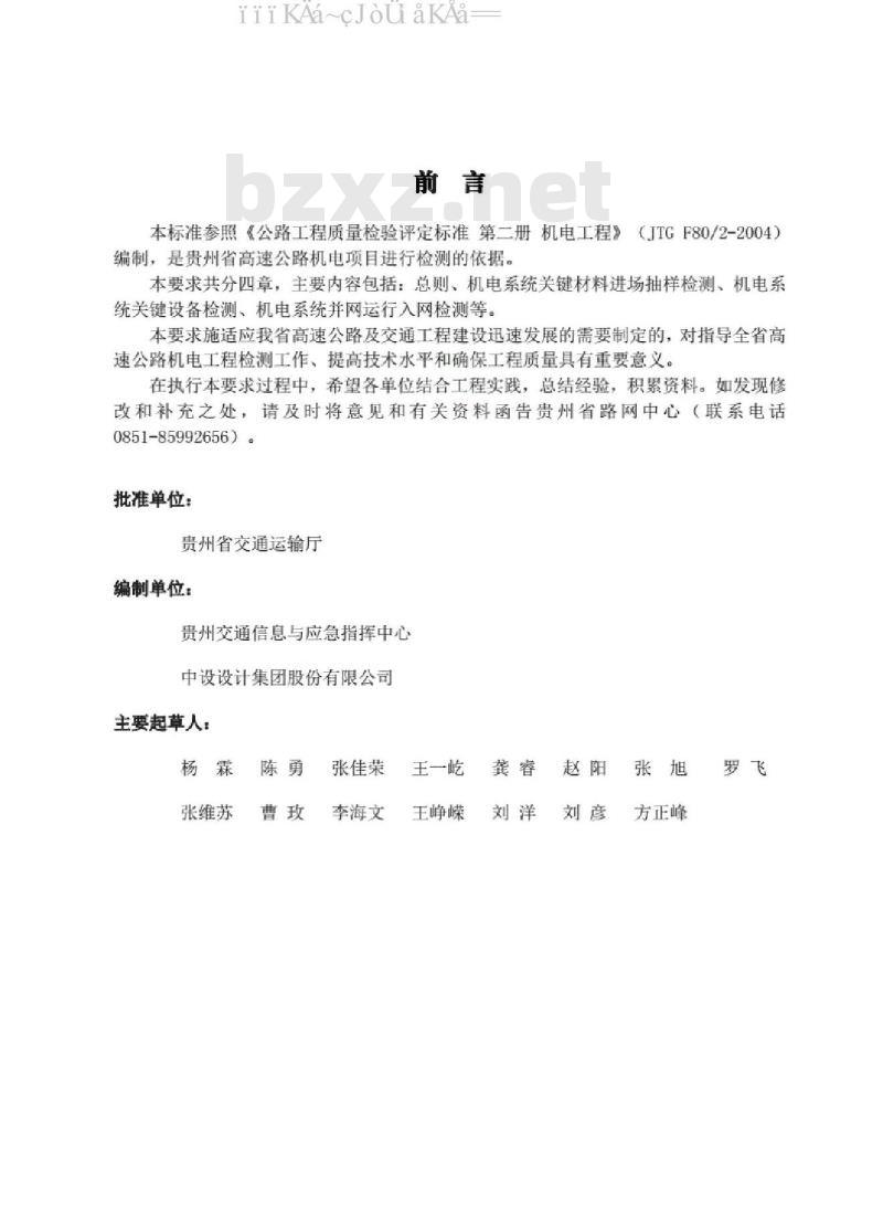 本标准参照《公路工程质量检验评定标准第二册机电工程》(JTGF80/2-2004)编制,是贵州省高速公路机电项目进行检测的依据。本要求共分四章,主要内容包括:总则、机电系统关键材料进场抽样检测、机电系统关键设备检测、机电系统并网运行入网检测等。本要求施适应我省高速公路及交通工程建设迅速发展的需要制定的,对指导全省高速公路机电工程检测工作。提高技术水平和确保工程质量具有重要意义。在执行本要求过程中,希望各单位结合工程实践,总结经验,积累资料。如发现修改和补充之处:请及时将意见和有关资料函告贵州省路网中心(联系电话0851-85992656)