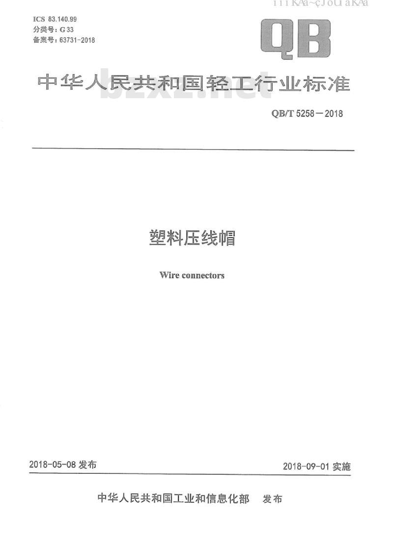 本标准适用于以尼龙66树脂为主要原料,经注塑加工或组装(安装金属管或弹簧)制成,额定工作电压不高于450V,在-20℃~+55℃环境使用的塑料压线帽。