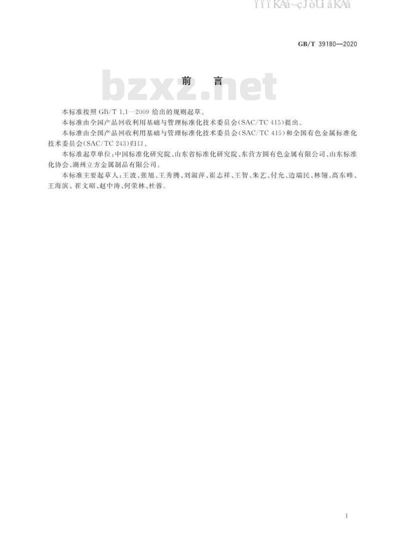 本标准由全国产品回收利用基础与管理标准化技术委员会(SAC/TC415)提出。本标准由全国产品回收利用基础与管理标准化技术委员会(SAC/TC415)和全国有色金属标准化技术委员会(SAC/TC243)归口。本标准起草单位:中国标准化研究院、山东省标准化研究院、东营方圆有色金属有限公司、山东标准化协会、湖州立方金属制品有限公司。本标准主要起草人:王波、张旭、王秀腾、刘淑萍、崔志祥、王智、朱艺、付允、边瑞民、林翎、高东峰、王海滨、崔文昭、赵中涛、何荣林、杜蓉1