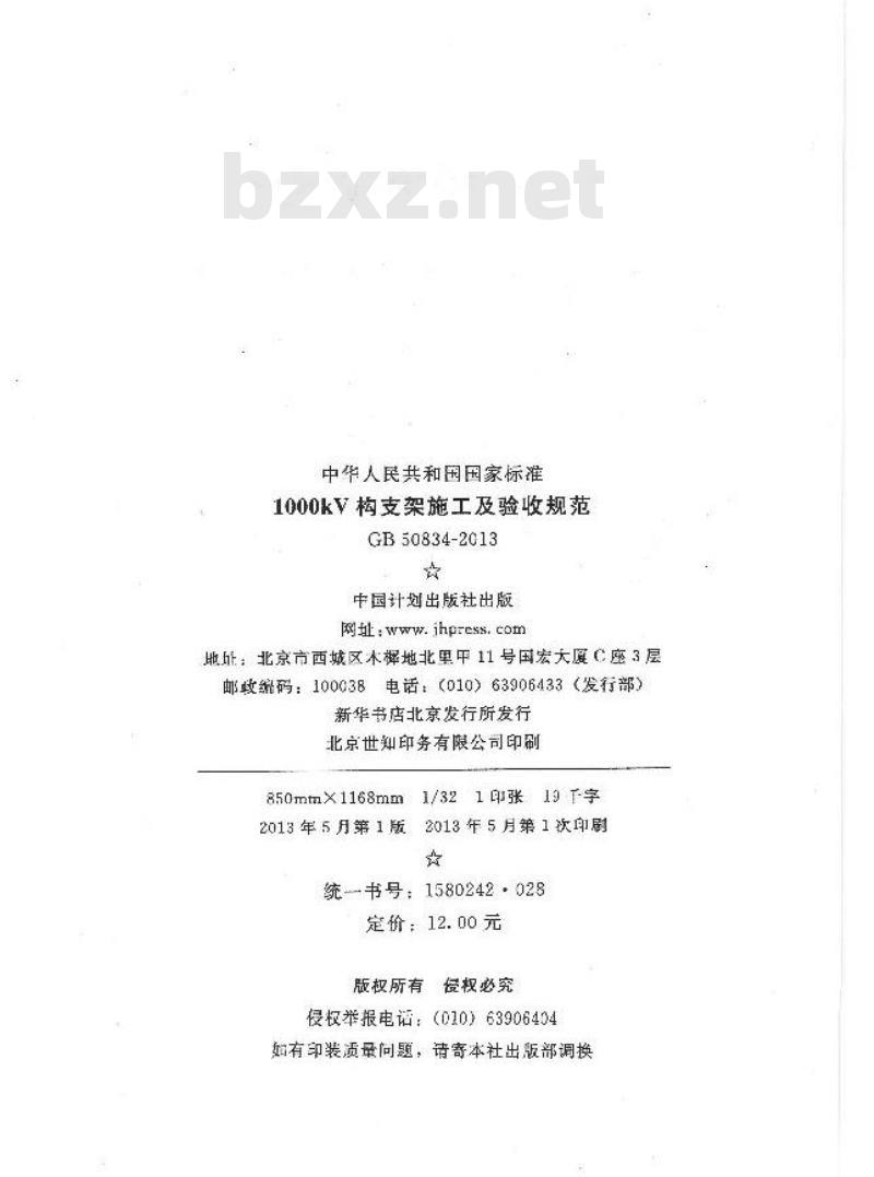 住房城乡建设部关于发布国家标准《1000kV构支架施工及验收规范》的公告现批准《1000kV构支架施工及验收规范》为国家标准,编号为GB50834一2013,自2013年5月1日起实施。其中,第4.1.3,4.3.4条为强制性条文,必须严格执行。本规范由我部标准定额研究所组织中国计划出版社出版发行。